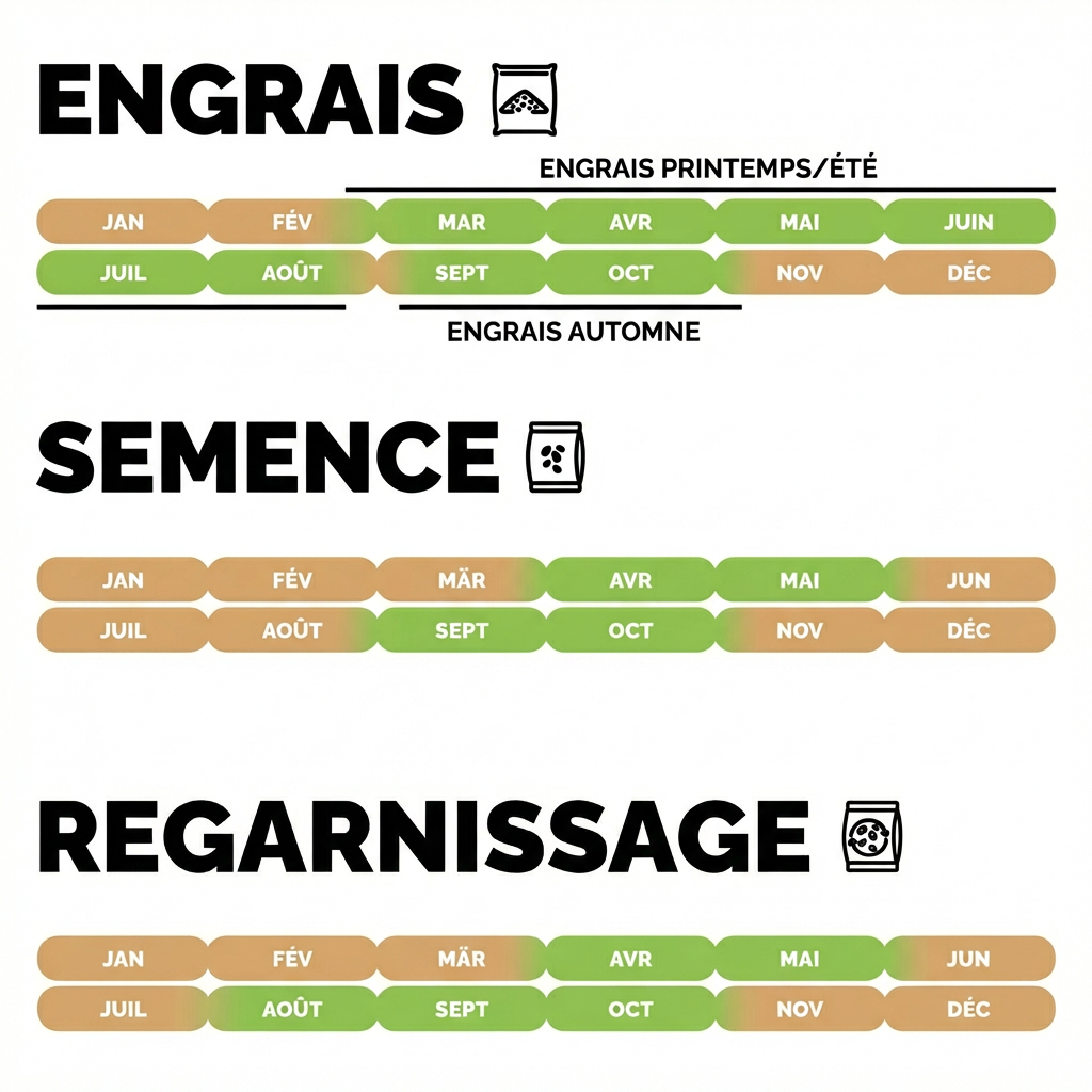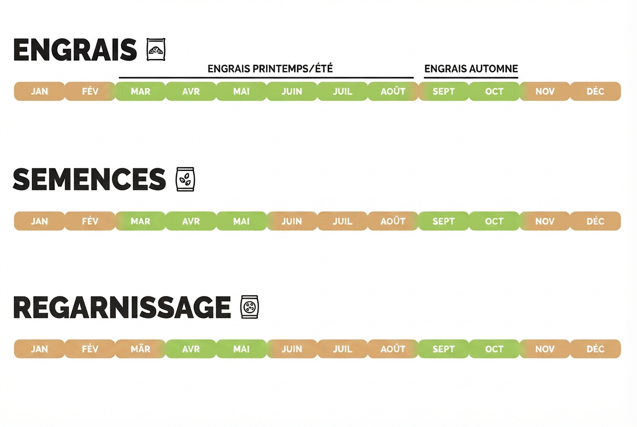 Les principales périodes de fertilisation se situent au printemps (mars–avril) et en été (juin–juillet). Une fertilisation supplémentaire à l’automne, en septembre ou octobre, renforce le gazon avant l’hiver.