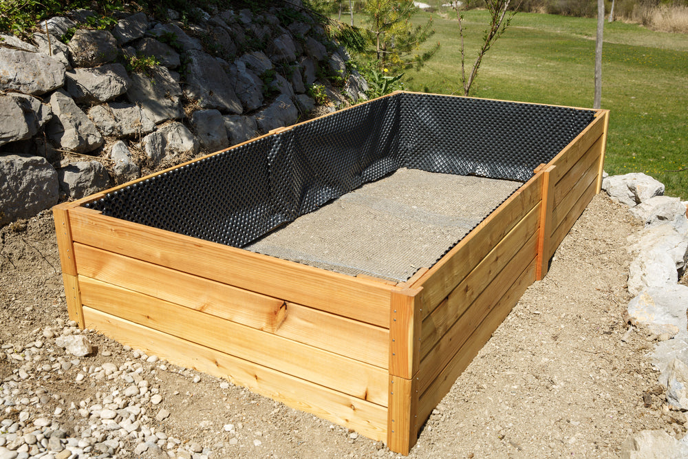 Für ein stabiles Hochbeet aus Holz empfehlen sich Lärchen- oder Douglasienbretter, Balken für die Ecken und Teichfolie oder Noppenfolie als Feuchtigkeitsschutz. Ein Wühlmausgitter unter der Drainageschicht bewahrt Dein Beet vor Wühlmäusen. Mit einem fertigen Bausatz oder individuell zusammengestellten Materialien kannst Du den Bau des Hochbeets starten und direkt loslegen.