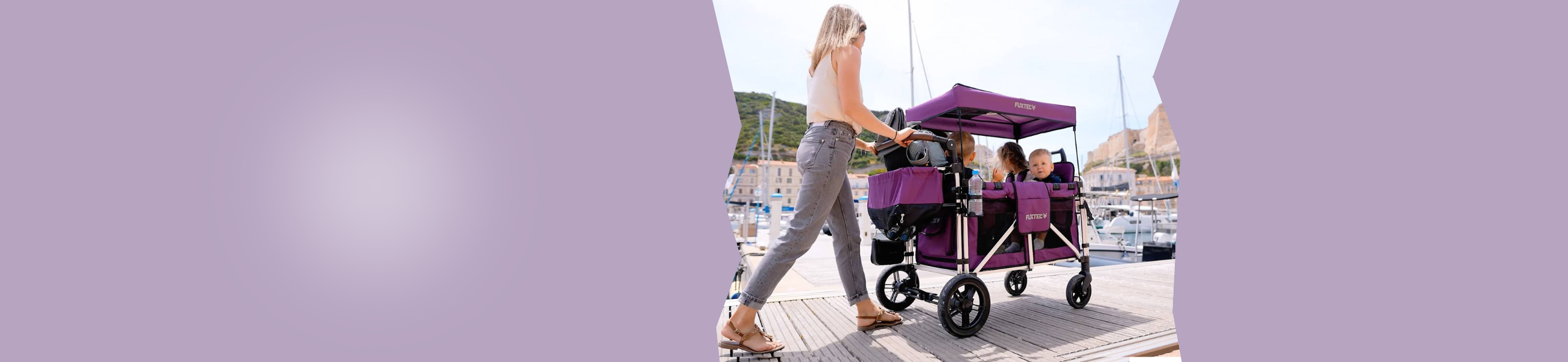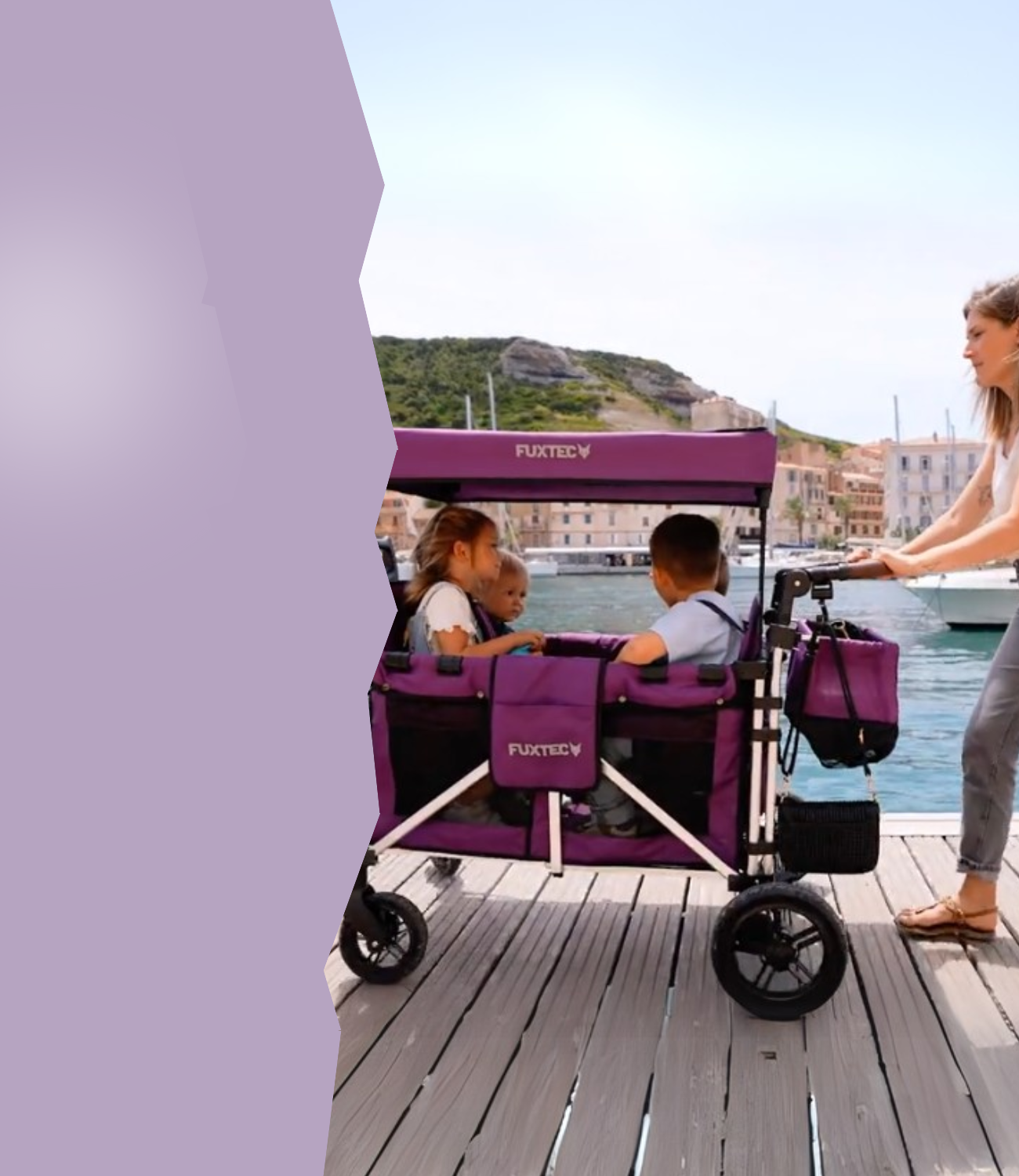Bei mehreren kleinen Kindern in der eigenen Familie, dem Ausflug mit dem Kindergarten oder dem Kindergeburtstag bieten die größeren, faltbaren Bollerwagen bis zu vier Kindern gemütlich Platz. Gepolsterte Boden- und Rücklehnen sorgen für noch mehr Komfort. Jeder Doppelsitz ist bis zu 30 kg belastbar.
