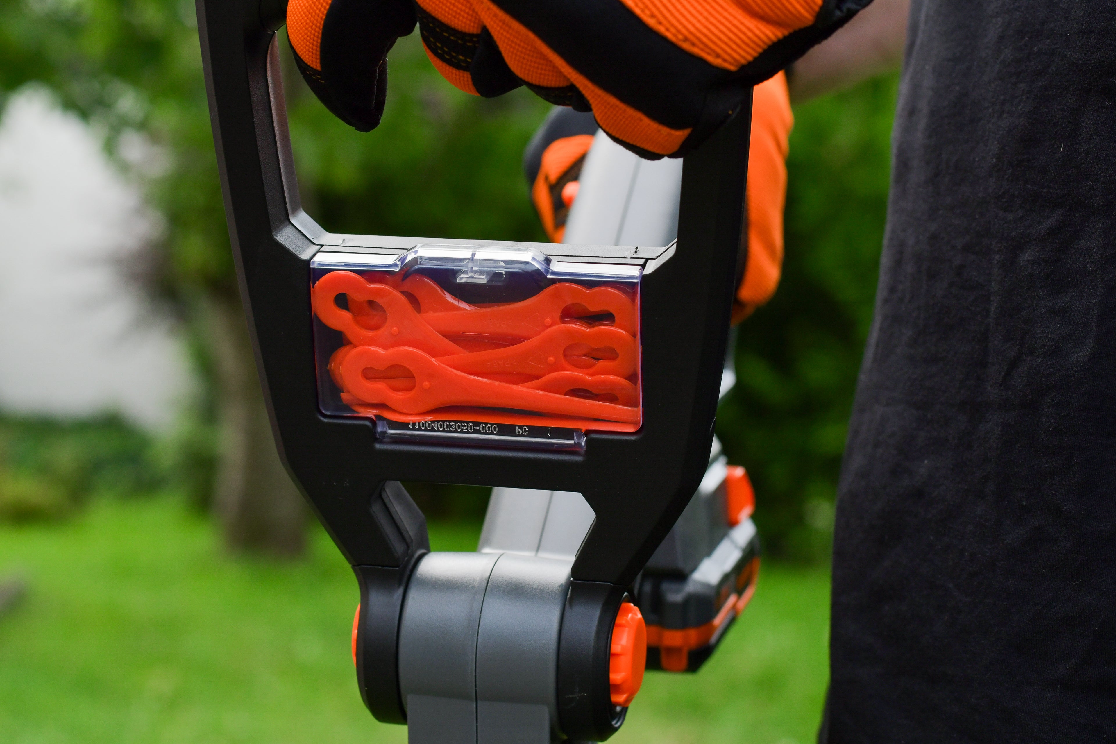 - Poignée avant avec compartiment supplémentaire pour les lames de rechange (20 lames de rechange incluses)
