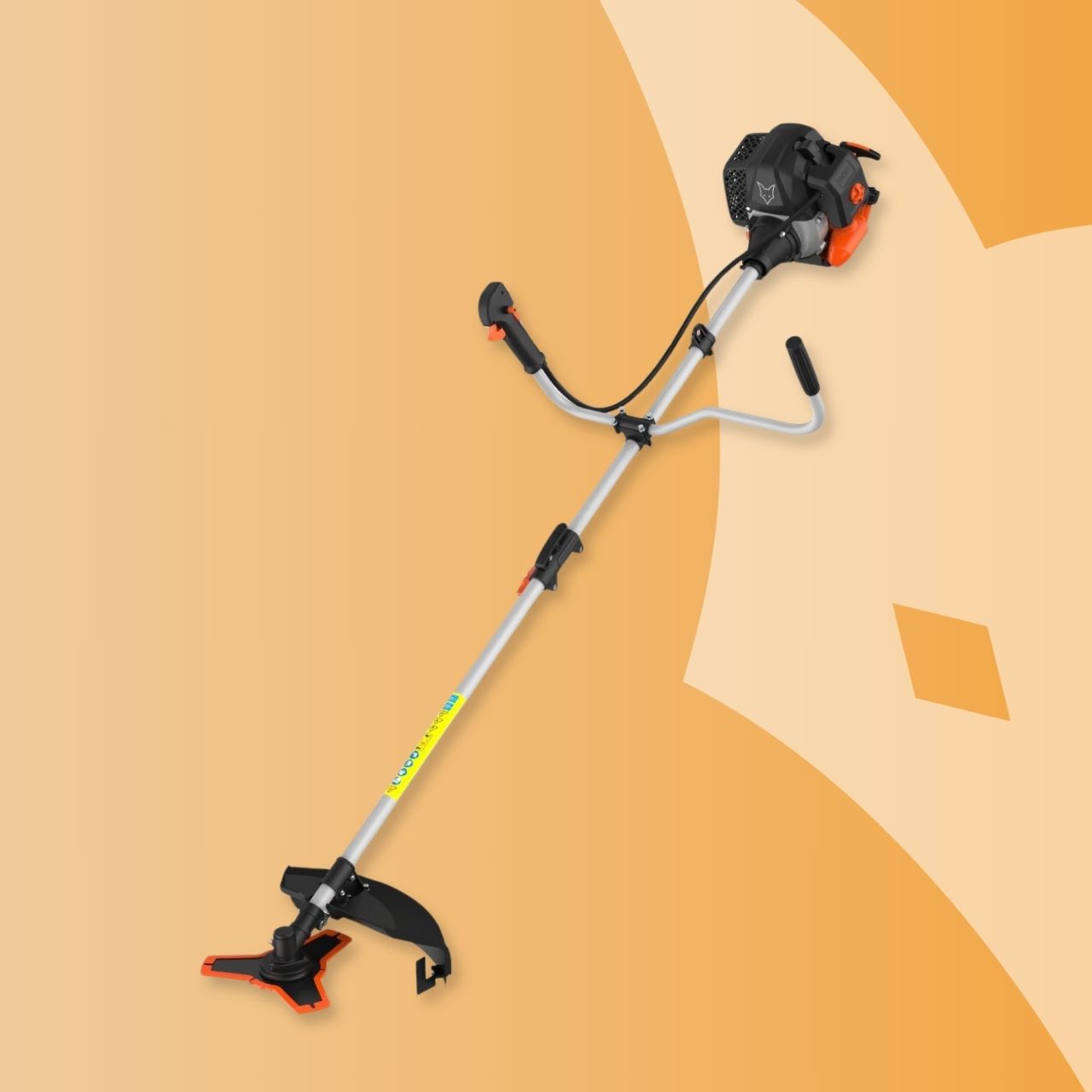 Débroussailleuse avec double poignée ergonomique, manette des gaz et coupe précise. Répartition des masses optimale.