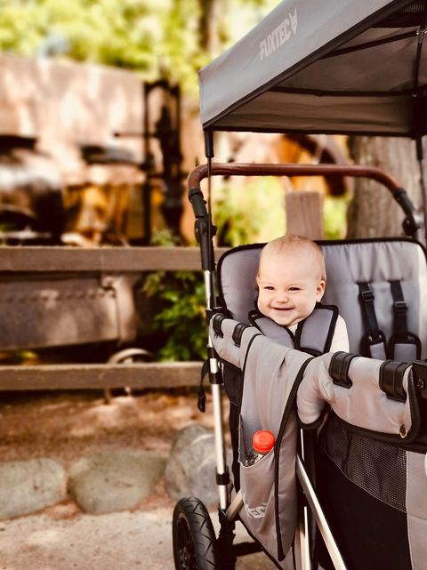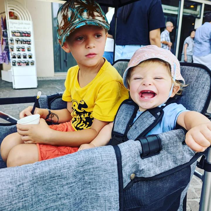 Le chariot Family Cruiser peut être tiré ou poussé. Il est disponible en gris ou gris premium.